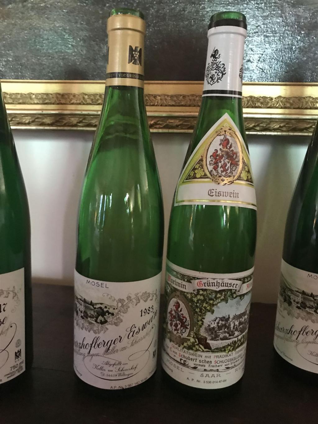 Wie schön, dass Maximin von Schubert aus dem großartigen Eiswein-Jahrgang 1983 stammte. Nachdem die Winzer im Jahrgang 1982 leer ausgingen, da der erste Frost erst im Februar 1983 kam, stimmte beim Jahrgang 1983 alles. So kamen wir in den Genuss zwei sehr edler, rarer Tropfen. In den Frühstunden des 15. Novembers konnte z.B. auf dem Scharzhofberg bei Minus 12 Grad mit 200 Öchsle ein traumhaftes, güldenes, sehr stimmiges Elixier geerntet werden, dessen intensive, verschwenderische Süße perfekt durch eine reife, aber kräftige Säure abgepuffert wurde. Dieser 1983 Scharzhofberger Eiswein ist zurecht legendär und lässt am Gaumen alle Papillen in Hab Acht stehen – WT99. Der 1983 Maximin Grünhaus Abtsberg Eiswein war ein reichhaltiger, aber mit guter Säure balancierter Wein mit Organgenbittermarmelade und Karamell, dezent, aber nicht unangenehm oxidativ – WT96.