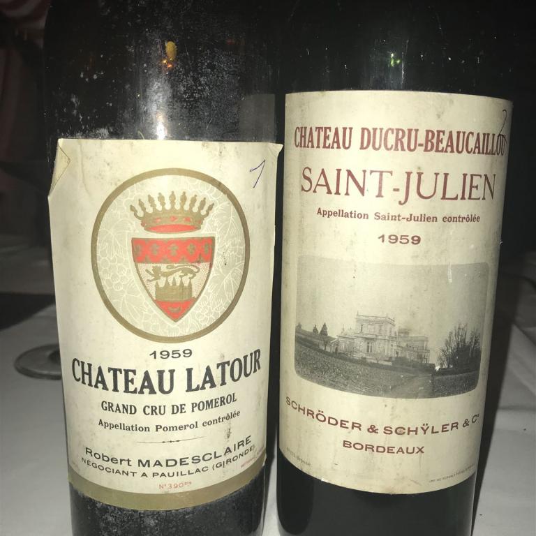Beim nächsten Flight hieß es dann am Tisch, wir kämen jetzt zu den jüngeren Weinen. Weit gefehlt. Aber das, was da wieder aus dem großen Jahrgang 1959 ins Glas kam, war wieder absolute Klasse. Der 1959 Latour-a-Pomerol in einer Bordelaiser Händlerabfüllung von Robert Madesclaire war einfach außerweltlich gut und hedonistich, die Kraft und die Herrlichkeit, mit cremiger Fülle einfach sexy, aber auch mit sehr gutem Rückgrat für längere Alterung, muss sich hinter dem legendären 61er nicht verstecken – WT99. Eile ist auch nicht angesagt beim 1959 Ducru Beaucaillou in einer französischen Schröder&Schyler Abfüllung. So elegant und balanciert, altersfrei mit nobler Ausstrahlung und exzellenter Struktur – WT97.