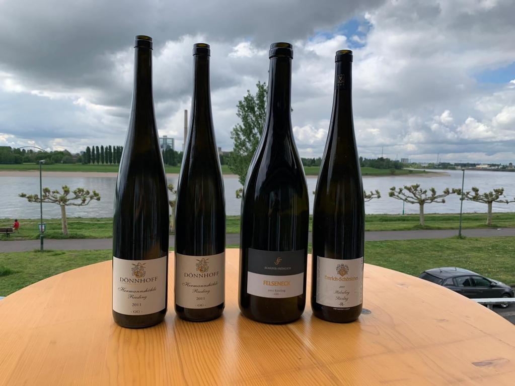 Dreimal Weiß aus vier Magnums war als Start angesagt. Gleich zweimal war die 2011 Hermannshöhle GG von Dönnhoff angesagt. Zweimal deshalb, damit die nacheinander eintreffenden Gäste auch alle etwas abbekamen, eine sehr kluge Entscheidung. Ob man diese Hermannshöhle jetzt trinken sollte, darüber kann man natürlich streiten. Ein großartiger Wein mit großer Zukunft, der aber wie viele 2011er jetzt etwas im „11er-Loch“ hängt. So blieben die unerhörte Brillianz, die messerscharfe Präzision und die intensive Mineralität dieses Weines zumindest stückweit hinter einem dezenten Schleier verborgen. Wann sich das ändert, ob schon in einem halben Jahr, nächstes oder gar übernächstes Jahr, lässt sich schwer vorhersagen. Das hängt auch von der Lagerung ab. Bernds Keller ist wie meiner sehr kalt. Da dauert eine solche, verschlossene Phase etwas länger. Dafür altert der Wein besser und macht erheblich länger Freude. Deshalb Jammern auf hohem Niveau und nur WT93+. Di WT96 oder vielleicht mehr sind aber in Sichtweite. Das galt auch das noch etwas verschlossenere 2011 Felseneck GG von Schäfer-Fröhlich aus der DM, das sich in ein paar Jahren mit der Hermannshöhle einen faszinierenden Wettstreit mit der Hermannshöhle um den besten Wein des Jahrgangs liefern wird – WT92+. Deutlich offener mit schöner Frucht und feinem Schmelz der durch die sehr gut eingebundene Restsüße inzwischen harmonisch trocken wirkende 2011 Halenberg R von Emrich-Schönleber aus der Magnum – WT95.