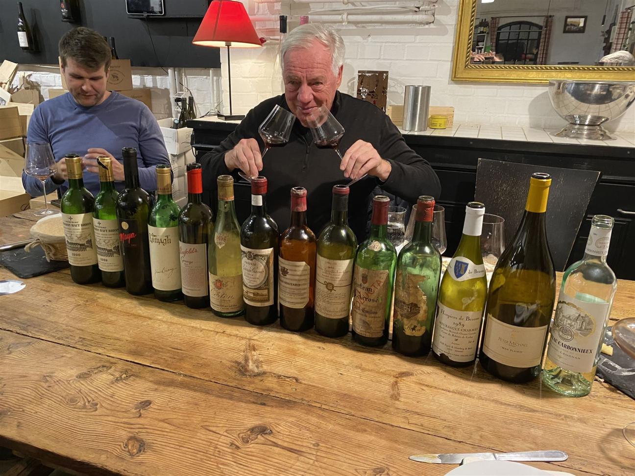 Wir starteten als Apero mit einem immer noch frischen 2016 Carbonnieux Blanc. Der war floral mit Apfel, reifer Banane und Popcorn, dabei mineralisch mit guter Säure – WT90. Der 2004 Mon Plaisir Chardonnay von Peter Michael trug aus der famosen Magnum diesen Namen zurecht. Nach 20 Jahren zeigte der immer noch eine wunderbare Frische, reife, gelbe Frucht, nussige Aromen, schönen Schmelz und trotz heftigen Alkohols (14,6%) geradezu spielerische Eleganz mit burgundischen Konturen – WT96. Es ist schon erstaunlich, dass die großen kalifornischen Chardonnays den burgundischen Vorbildern nicht nur in der Aromatik, Eleganz und Finesse ebenbürtig sind, sondern mindestens gleich gut, wenn nicht teilweise sogar besser, altern. Deutlich reifer wirkte der allerdings auch 15 Jahre ältere 1989 Meursault Charmes Cuvée de Bahèzre-de-Lanlay vom Hospice de Beaune aus der Zeit vor Premox, als Weiße Burgunder noch gut und länger alterten. Der zeigte ein tiefes Goldgelb, war sehr würzig, leicht harzig mit dezenter Apfelnote und guter Säure. Hielt sich im Glas und baute gut aus – WT93.