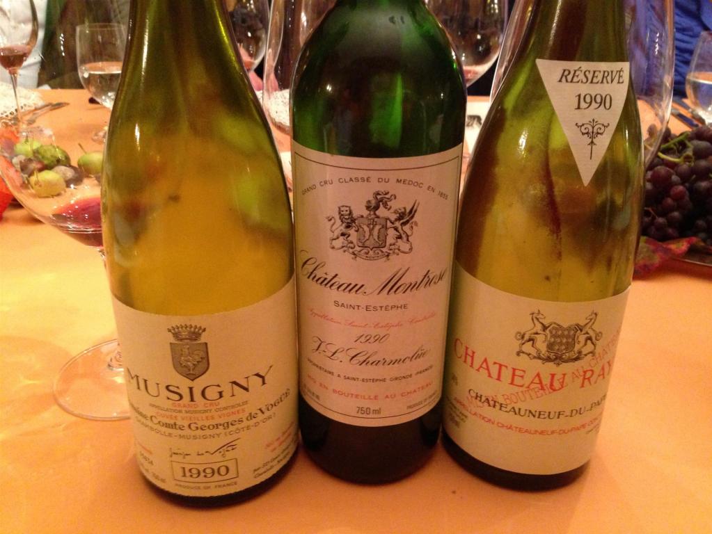 Nach diesem fulminanten Rotweinstart fragte ich mich schon, was unser Gastgeber bezweckte und wie dieser Abend weitergehen sollte. Das war eine verdammt hohe Meßlatte, die er sich da selbst gelegt hatte. Im ersten Glas des zweiten Rotweinflights ein Wein, für den ich mich noch nie erwärmen konnte, der 1990 Musigny Vieilles Vignes von Comte de Vogüe. Enorm kräftig mit viel Substanz, mit sehr guter Frucht und gewaltiger Struktur, dabei erstmals offener und einen guten Ausblick auf das gebend, was da in den nächsten 10-20 Jahren mal kommen könnte – WT96. Da unser Gastgeber eigentlich nie etwas dem Zufall überlässt, dürfte er diesen Wein wohl sehr lange vorher dekantiert haben. Das dürfte dann auch mit dem 1990 Montrose passiert sein, denn aus dem animalisch rustikalen Monster war hier ein Schmusemonster geworden, erstaunlich offen mit dekadenter Süße und Fülle, an die besten Flaschen der jugendlichen Fruchtphase erinnernd – WT100. Ein hedonistischer Traum im dritten Glas dieses süße, würzige Pfauenrad an Aromen namens 1990 Chateau Rayas – WT100. Das war jetzt 100-Punkte-Legende #4. Strebte hier jemand die Aufnahme ins Guiness Buch der Rekorde an?