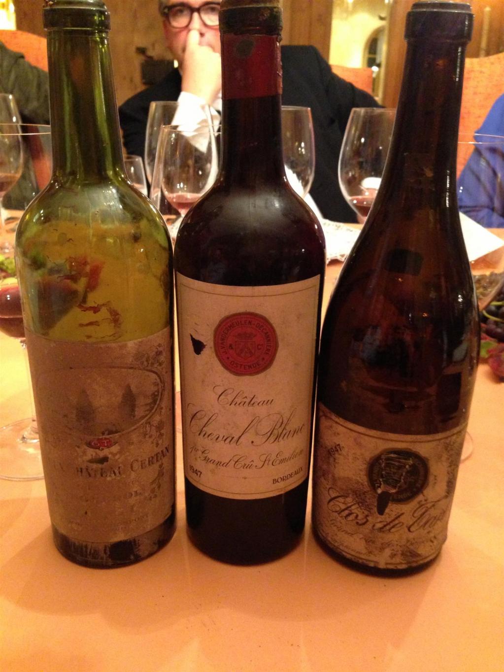 Der schiere Wahnsinn im nächsten Flight 1947 Vieux Chateau Certan aus einer belgischen Händlerabfüllung. In der sehr dichten Farbe und der gesamten Anmutung so dicht, so konzentriert und so jung, Traumnase mit süßer Schwarzkirsche und Minze, die am kraftvollen Gaumen noch intensiver wurde, dazu feine Süße, leicht portige Noten und bei allem Druck eine betörende Eleganz, einfach perfekt – WT100. Dagegen erblasste der großartige 1947 Cheval Blanc Vandermeulen, der ebenfalls mit der Perfektion flirtete, förmlich. Cheval Blanc und Eleganz pur, keinerlei Schwächen oder Alter – WT98. Voll mithalten konnte in diesem atemberaubenden Flight der 47er Legenden der außerweltliche 1947 Clos de Tart Vandermeulen. Was für ein großer, dichter, reifer Burgunder mit Kaffee und Mokka ohne Ende, mit dekadenter Süße und irrer Länge – WT100.