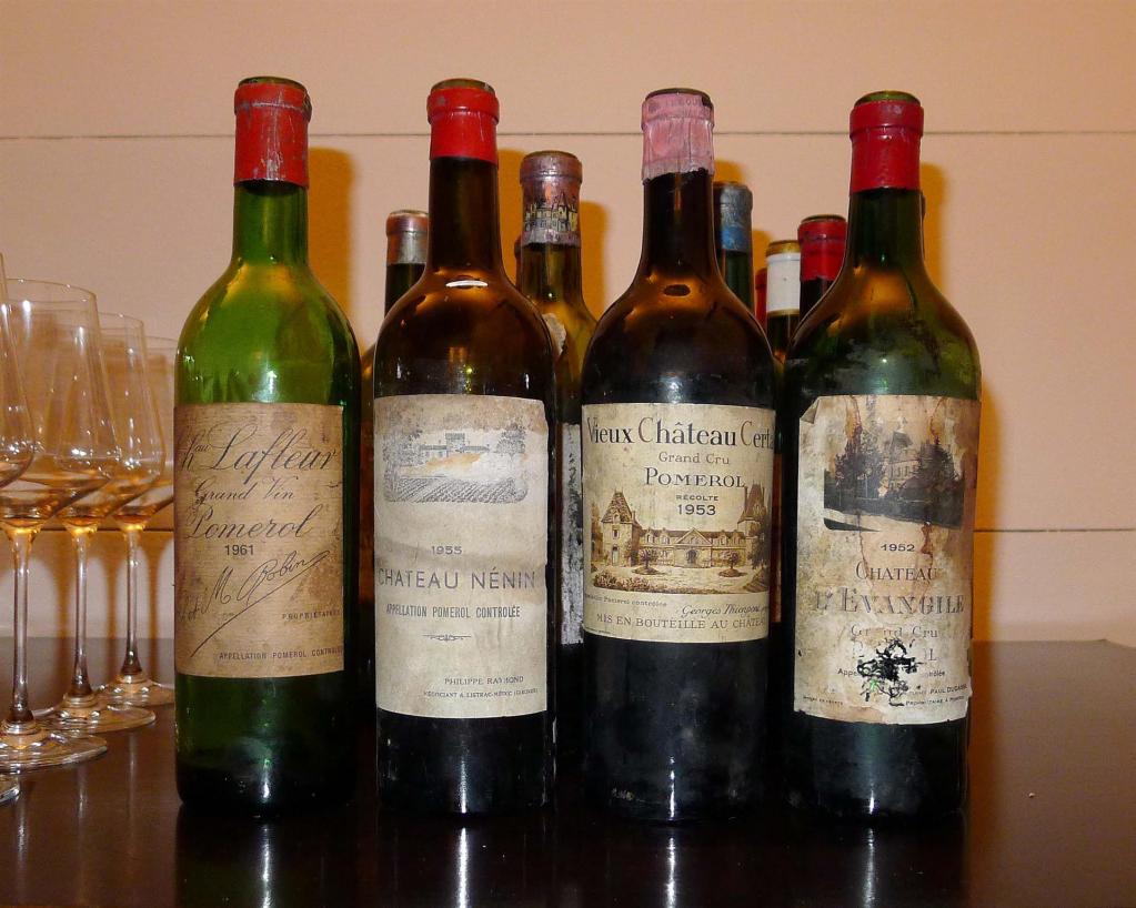 Voll daneben lagen wir leider bei 1961 Lafleur in belgischer Abfüllung. Der hatte mit Lafleur nichts zu tun, mit dem großen 61er schon überhaupt nicht. Das war ein harmloser, durchaus leckerer, süßer Wein ohne viel Struktur mit junger Farbe. Erinnerte mich fatal an den vermeintlichen 61er, den ich bei der großen Lafleurprobe am Attersee im Glas hatte. Der Fairness halber sei gesagt, dass Uwe Bende vor der Probe klar daraufhin gewiesen hatte, dass sowohl der 61er Lafleur als auch die La Missions Risikoflaschen waren, deren Echtheit er nicht garantieren könne. Letztlich schlug sich das auch in der sehr fairen Kalkulation der Probe nieder. Wie gut, dass die Fälscher dieser Welt sich noch nicht für Nenins interessieren. Alte Nenins sind eine – noch dazu bezahlbare – Bank, so auch dieser 1955 Nenin, der bei insgesamt noch recht junger Farbe mit feinem Schokoschmelz, aber auch guter Struktur und Säure überzeugte – WT94. Laktisch und oxidiert leider der 1953 Vieux Certan, den ich dramatisch besser kenne. Und gleich daneben noch eine Pleite. Der 1952 l´Evangile hatte eine vielversprechende, junge Farbe, aber leider Kork. Uwe Bende, der einem an diesem Abend mit seinem unverschuldeten Künstlerpech wirklich leid tun konnte, zauberte schnell noch einen, für diese Probe eigentlich nicht vorgesehenen 1959 Angelus in perfekter Chateauabfüllung aus dem Ärmel. Ein maskuliner, kräftiger, junger Wein mit sehr guter Struktur und der strammen 59er Säure, die diesem Wein noch ein längeres Leben bescheren dürfte – WT94.