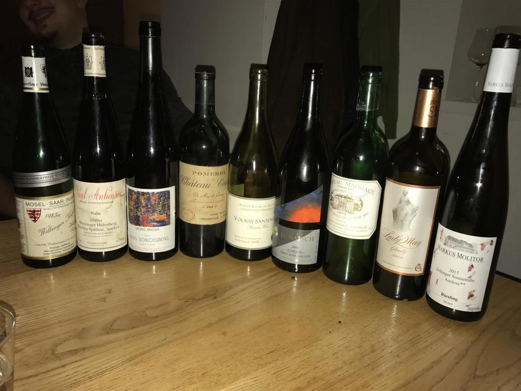Und was hatten wir im Glas? Los ging es mit einer wunderschönen 1983 Wiltinger Kupp Auslese von Hubert Schmitz (das ehemalige Gut Graf Hoensbroch). Noch so frisch und balanciert mit feiner Frucht und Mineralität, Bienenwachs, gute Säure, ein animierender Start in den Abend – WT94. Furztrocken die 1989 Monzinger Halenberg Spätlese trocken von Anheuser mit frischer Frucht, guter Säure, leicht salziger Mineralität und für schlappe 10,5% Alkohol erstaunlichem Extrakt – WT90. Einfach Weltklasse der rassige, stoffige 1999 Schlossberg von Breuer mit unglaublicher Strahlkraft, absolut trocken mit reifer, gelber Frucht und hoher Mineralität, wie aus einem Stück gemeißelt – WT97. Und dann dieser großartige 1961 Certan de May, der nicht nur in der Farbe immer noch so jung wirkte. Klar war dieses Gut nie ein weichgespülter Schmusepomerol. Eher etwas auf der kernigen, leicht rustikalen Seite mit glockenklarer Frucht, schöner Süße und verhaltener Schokolade. Leicht trockene Tannine verhindern einen Jahrhundertwein – WT96. Noch so taufrisch wirkte der 1978 Volnay Santenots 1er Cru aus der Collection Bellenum des Maison Roche de Bellene. Filigrane, präsente Frucht, feine rote Beeren, soviel Spiel und Eleganz, entwickelte sich eorm im Glas und hat noch eine große Zukunft – WT93. Grosse Überraschung der unglaublich druckvolle 2004 Pinot Noir Unique von Donatsch. Martin Donatsch hatte mir noch gesagt, dass das nicht sein bester Jahrgang gewesen sei, er ihn aber lange nicht mehr im Glas hatte. Für mich stzte der auf eine vor zwei Wochen getrunkene 2005er Magnum noch eins drauf. Ein wunderbarer Pinot, der mit Süße, Fülle, Kraft und Struktur überzeugte – WT95. Da sollte der liebe Martin vielleicht mal wieder in seinen Keller steigen. Aus Tonis Geburtsjahr hatte ich noch einen 1979 Chateau Margauxt mitgebracht, der sich wieder von seiner allerbesten Seite zeigte. Aus einer perfekt gelagerten OHK war das Margaux pur, die klassische Eisenfaust im Samthandschuh mit betörender Frucht, so feinduftig und elegant, ein Margaux zum Knutschen – WT96. Und was schmeckt wie eine großartige Pichon Comtesse, die nur einen Bruchteil des Originals kostet und von einem anderen Erdteil kommt? Das ist 2010 Lady May, der Top Wein von Glenelly aus Südfarika. Die ehemalige Pichon Comtesse Besitzerin May-Eliane de Lencquesaing hatte 2003 in weiser Voraussicht bei Stellenbosch dieses Glenelly Estate gekauft, 2004 komplett bepflanzt und 2008, ein Jahr nach dem Comtesse-Verkauf, hier den ersten Wein erzeugt. Der zu Anfang etwas kompakte, maskuline 2010er hat sich inzwischen prächtig entwickelt. Eine echte Comtesse aus Südafrika mit dem Charme und dem Schmelz des Originals – WT94. Und dann öffnete Toni zum Schluss noch die viel zu junge D-Vine Designer-Edition der 2015 Zeltinger Sonnenuhr Auslese trocken** von Markus Molitor. Klar war das noch ein Weinbaby, aber mit fantastischen Anlagen. Auch jetzt in der jugendlichen Fruchtphase schon ein Hochgenuss – WT93+.