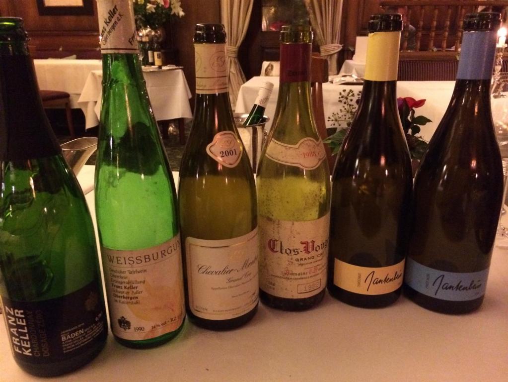 Für viele Weinfreaks ist der Schwarze Adler mit seiner riesigen, sehr gastfreundlich kalkulierten Weinkarte eine der Pilgerstätten überhaupt. Über einen schier unerschöpflichen Fundus gebietet die sehr charmante und kenntnisreiche Chefsommelière Melanie Wagner. Auch diesmal sind wir ihrem kompetenten Rat gefolgt. Spektakulärer Start ein sehr gut gelungener 2010 Chardonnay Sekt Dosage Zero vom Weingut Franz Keller. Mit seiner brillianten Frucht, seiner Rasse und Komplexität lässt er so manchen Champagner alt aus sehen – WT92. Keine Frage, dieses Weingut ist auf der Überholspur. Sehr überrascht waren wir auch vom 1990 Weissburgunder A des Hauses, Fritz Kellers Erstlingswerk. Der war immer noch voll da mit reifem Schmelz und schöner Edelfirne in der Nase, am Gaumen mit sehr guter Säurestruktur und burgundischer Fülle. Wir haben diesen Wein über Stunden immer wieder probiert, er baute nicht ab – WT94. Für mich war er fast ebenbürtig mit dem hoch eleganten 2001 Chevalier Montrachet von Sauzet. Das war Eleganz pur, so mineralisch, so fein mit großem Spannungsbogen, wurde mit Luft und Temperatur (die er beide brauchte) cremiger und länger – WT95. Ein Volltreffer auch der noch extrem junge, kräftige 1988 Clos Vougeot von Roumier. Das war von der ersten Anmutung ein klassischer, großer, dichter, etwas rustikal wirkender Burgunder mit pflaumiger Frucht. Ein Wein mit enormem Potential, der über den Abend immer mehr zulegte und seinen Höhepunkt wohl erst in 5-10 Jahren erreicht – WT93+. Einfach genial der noch sehr junge, kräftige 2008 Gantenbein Chardonnay, der wohl erst 3-4 Jahren seine volle Klasse zeigen wird – WT93+. Gefolgt wurde er vom seidig-animierenden 2005 Gantenbein Pinot Noir mit betörender Frucht – WT95. Von beiden Gantenbeins und auch vom nach rareren Riesling finden sich jeweils mehrere Jahrgänge zu sehr freundlichen Preisen auf der Karte.