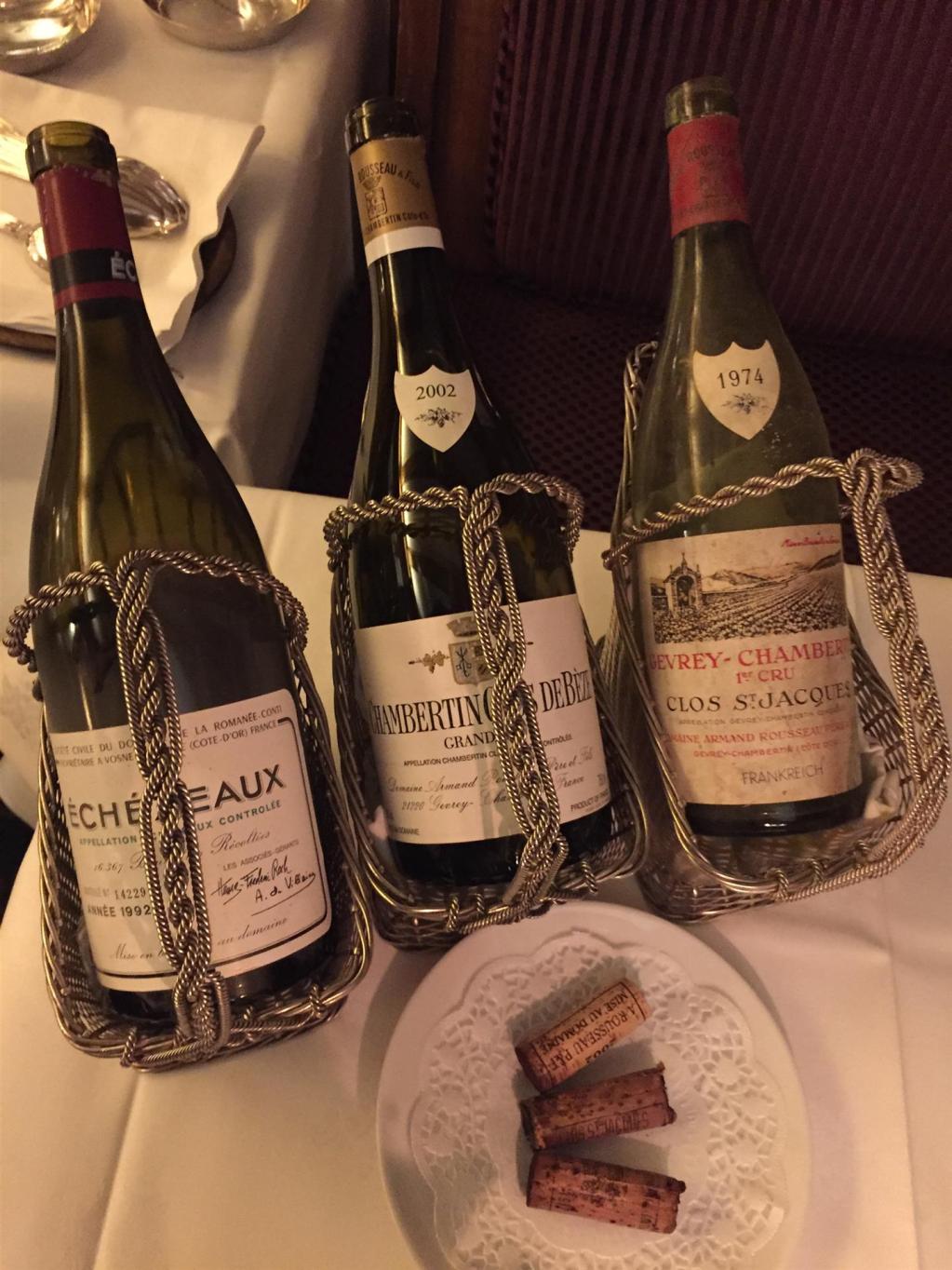 Zum Menü legten wir dann gleich mit Rotwein los. Unser erster Roter eine perfekte Empfehlung der überaus kenntnisreichen und charmanten Sommelière Melanie Wagner, ein 1974 Gevrey Chambertin Clos St. Jacques von Armand Rousseau. 1974, und der sollte gut sein? Nein, der war sehr gut. So vital mit feiner Frucht, einfach perfekt balanciert mit generöser Süße, dabei mit dieser unnachahmlichen Eleganz großer, gereifter Burgunder – WT96. Danach tat sich der noch so junge, kräftige 2002 Chambertin Clos de Bèze von Armand Rousseau zu Anfang fast etwas schwer. Aber der brauchte einfach Luft, Luft und noch mal Luft. Und was dann im Glas abging, war schon irre. Superbe, dunkle Frucht, feine Würze, sehr pikant, mit burgundischer Pracht und Fülle und großem Kräutergarten – WT96. Sicher ein Wein mit Zukunft. Im letzten Jahr hatte ich mich hier an Ort und Stelle an 1992 Richebourg und 1992 La Tâche von DRC rangetraut. Dieses Jahr versuchten wir es eine Nummer kleiner mit 1992 Echezeaux von DRC. Doch der war alles andere alimmer noch so jugendlich, so druckvoll mit enormem Tiefgang – WT96. Nicht das erste Mal, dass ein Echezeaux von DRC sich fast ebenbürtig mit den großen Brüdern zeigte.