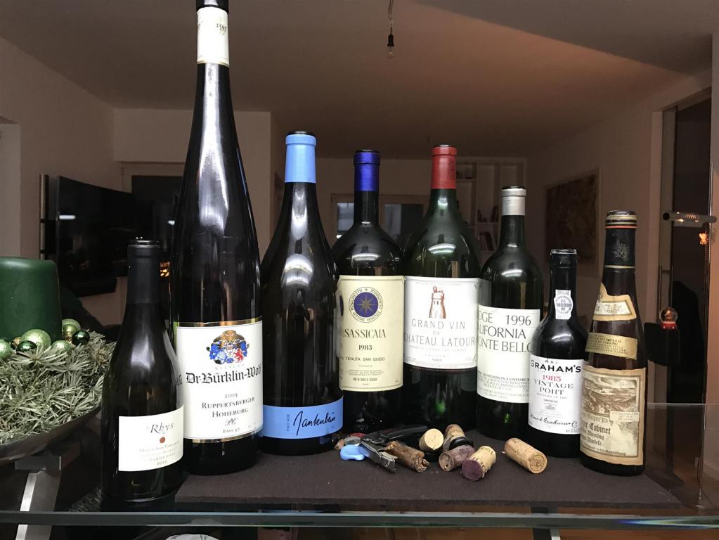 Mit einer 2005 Ruppertsberger Hoheburg Magnum Faß #57 von Bürklin-Wolf legten wir los. Im Gegensatz zu vielen 2005ern ist der nicht aus dem Leim gegangen und zeigt bei aller würziger Fülle und Reife immer noch eine großartige Struktur gepaart mit guter Säure und intensiver Mineralität – WT95. Absolut grandios präsentierte sich danach aus dem Geburtsjahr von „Herrn Ben“ und unserer bezaubernden Gastgeberin aus perfekter Magnum der 1983 Sassicaia. Viele haben den längst abgeschrieben, obwohl er jetzt erst richtig kommt. Mit seiner noblen Art, der Eleganz und Finesse und der feinen Mineralität wurde dieser 83er seiner Rolle als Lafite Italiens voll gerecht, großer Stoff – WT96. Jede Suche wert. Immer noch blutjung der 2004 Gantenbein Pinot Noir, der von Jahr zu Jahr enorm zulegt und aus dieser so druckvollen Magnum hier mit burgundischer Pracht und Fülle einen ganz großen Auftritt hatte – WT96.