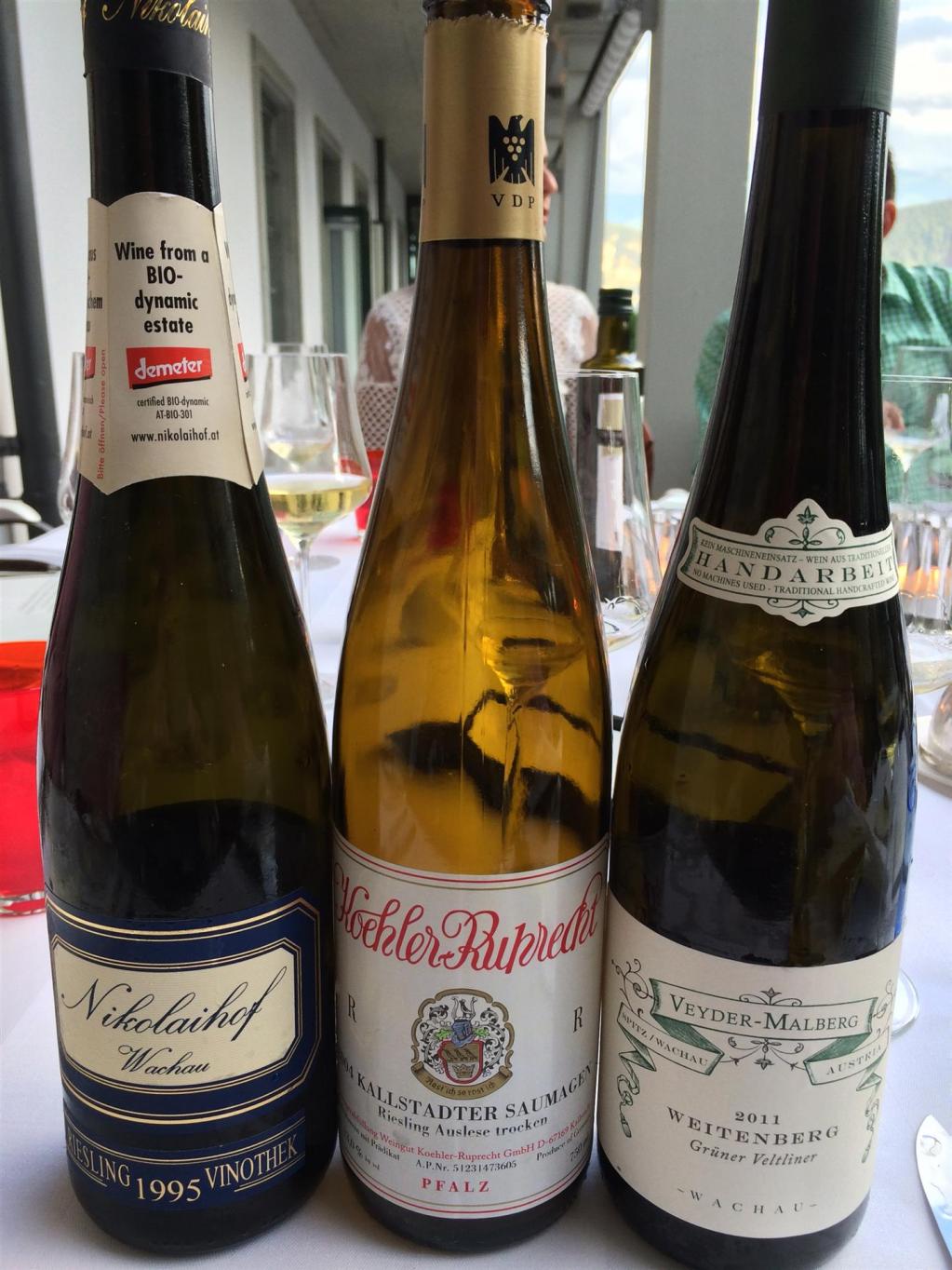 Gleich zum zweiten Mal innerhalb weniger Wochen durfte ich an diesem Abend den 1995 Nicolaihof Riesling probieren. Ultrarar ist dieser Wein inzwischen. Parkers Schreiberling für deutsche und österreichische Weine, David Schildknecht (er verließ den Wine Advocat zum 1. Juli und wurde ersetzt durch Stephan Reinhardt) hat diesen Wein als ersten, trockenen Riesling mit 100/100 geadelt. Mich konnte dieser Wein bei dieser zweiten Begegnung noch weniger überzeugen, als bei der ersten. Wahrscheinlich war der Wein leicht fehlerhaft. Brauchte viel Zeit und Luft, um sich überhaupt zu öffnen und startete dann eine stete Berg und Talfahrt zwischen grausam und gut trinkbar. Aber groß? Bestimmt nicht. Diese Bezeichnung traf eher auf den 2004 Kallstädter Saumagen Auslese trocken R von Koehler Rupprecht zu, den wir wieder mal auf der Weggis-Karte fanden. Ein kräftiger Wein, noch ganz am Anfang, mit kalkiger Mineralität, entwickelte mit Luft und Temperatur burgundische Dimensionen. Wird noch über lange Jahre zulegen – WT95+. Ausgesprochen gut gefiel mir auch der Dritte im Bunde, der 2011 Grüner Veltliner Weitenberg von Veider-Malberg. Sehr elegant, mineralisch, furztrocken und mit glockenklarer Frucht – WT94.