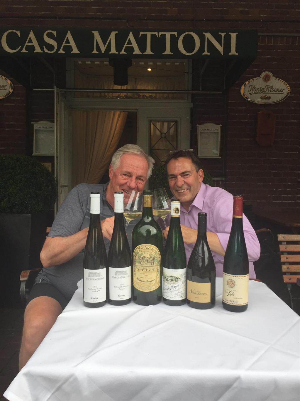 Wenn der liebe Gregor es mal nach Düsseldorf schafft - den Abend vorher hatte er mit dem geilen Konzert von Cold Play verbracht, für mich blieb nur der Lunch - dann gehört auch was Anständiges ins Glas. Perfekt der Molitor Start, die 2008 Zeltinger Sonnenuhr Auslese trocken**. Das war ein begnadeter Langstreckenläufer, sehr mineralisch, präzise, fein und im positiven Sinne schlank, wird sich gut zwei Jahrzehnte entwickeln und in ein paar Jahren deutlich mehr zeigen – WT92+. Die rassige, animierende 2012 Saarburger Rausch Auslese trocken ** zeigte deutlich mehr und war mit mehr Fülle an diesem Tag der größere Wein – WT94+. Bei 1986 Far Niente Cabernet Sauvignon aus der Magnum lag der liebe Gregor mit seiner Vermutung, das sei 82 Gruaud, aromatisch nicht daneben. Ein großartiger, klassischer Bordeaux aus Kalifornien, der im Glas zu immer neuen Höhen strebte. Perfekter vorläufiger Abschluss ein rassig-mineralischer 2014 Scharzhofberger Kabinett von Egon Müller. Warum der soviel kostet wie damals die Spätlesen? Weil er soviel Trinkfluss ins Glas bringt wie früher die Auslesen. Ein großartiger Wein mit perfektem Süße-/Säurespiel – WT93.