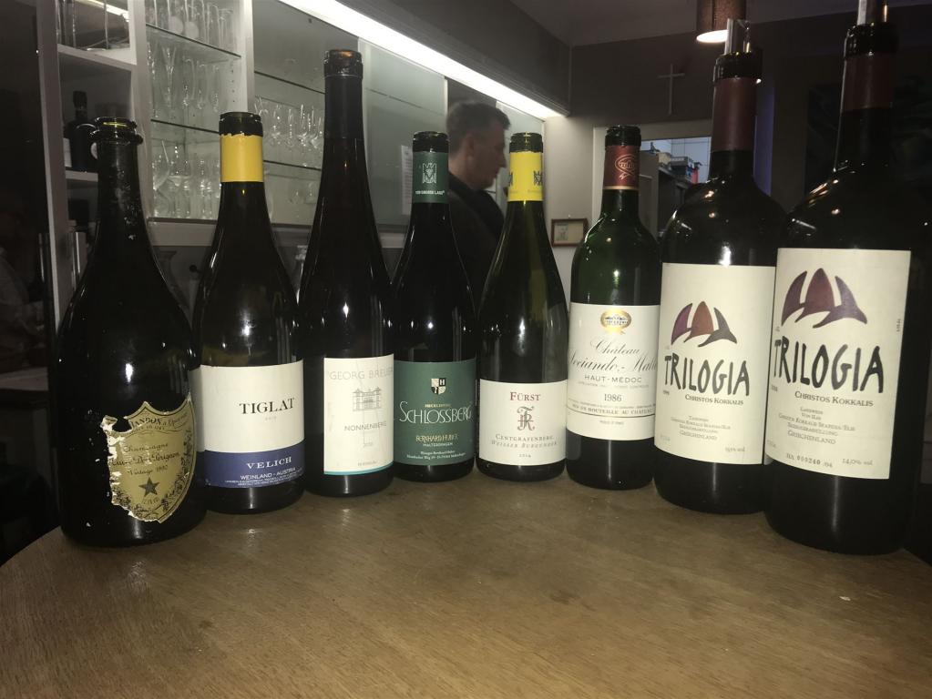 Wir starteten mit einem wohl perfekt gelagerten 1990 Dom Perignon in Bestform. Der startete undekantiert (unser Fehler) schlank, sehr frisch und mineralisch, legte aber enorm zu und gewann an Komplexität und Tiefgang, ein perfekt balancierter Champagner Traum – WT95. Kräftig mit feinem Schmelz, guter Säure und Struktur der 2013 Velich Tiglat Chardonnay – WT93. Rassig mit präziser Frucht der immer noch so frische 2010 Nonnenberg von Breuer, den ich aus anderen Flaschen auch schon reifer getrunken habe – WT94. Immer noch ganz am Anfang, aber mit großer Zukunft der 2015 Schlossberg Chardonnay GG von Bernhard Huber, reduktiv mit noch dezentem Sponti, feine Zitrusfrucht sehr präzise mit eher schlanken Konturen, kalkige Mineralität – WT95. Floral, burgundisch der 2014 Centgrafenberg Weisser Burgunder von Fürst – WT90. Ziemlich langweilig zeigte sich der für den Jahrgang schon verdammt reife 1986 Sociando Mallet – WT85. Dank vieler Mittrinker wurde die Flasche dann doch noch leer, aber Begeisterung stellte sich nicht ein. Die kam dann bei Christos Kokkalis geilem 1999 und 2004 Trilogia aus der Magnum. Franz Josef Schorn hatte damals die Weine seines Freundes Christos in Deutschland eingeführt und populär gemacht. Die waren früh trinkbar mit fantastischem Preis-/Leistungsverhältnis, altern aber hervorragend. Dieser 1999 aus der Magnum ist noch so frisch mit verschwenderischer Frucht und einfach ober-sexy – WT95. Auch der etwas kräftige 2004er hat deutlich zugelegt – WT94.