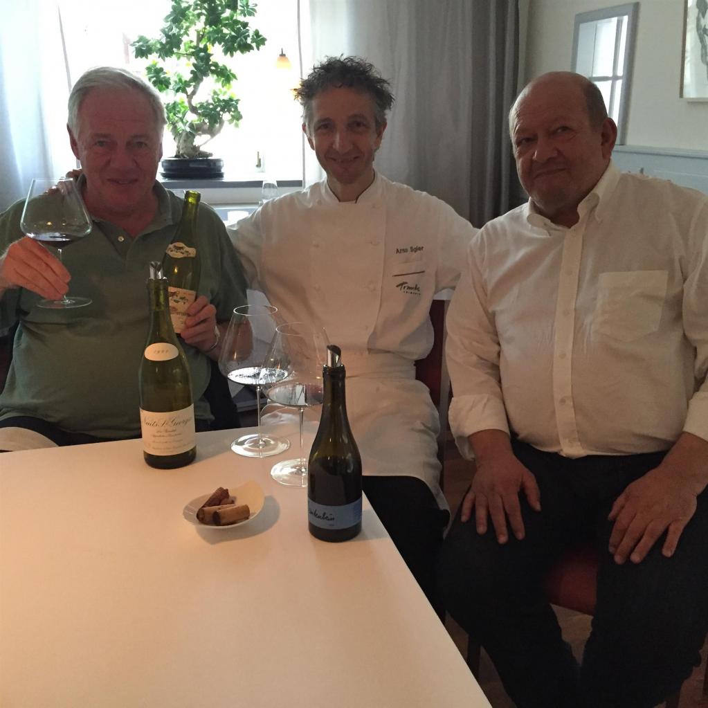 Ja, wir haben noch mal zugeschlagen und uns die wohl letzte Flasche des atemberaubenden 2002 Meursault Perrières von Coche-Dury gegönnt. Das war ein finessiger, nachhaltiger, sehr mineralischer Traum mit nur dezent spürbarem Holz, messerscharfer Präzision und ewigem Abgang – WT98. Und natürlich konnten wir auch nicht am sehr spannenden 1992 Nuits-St.-Georges von der Domaine Leroy vorbei, einem facettenreichen, tiefgründigen Wein, der sich unglaublich im Glas entwickelte und dabei mit stärker hervortretender Frucht immer jünger wurde, einfach groß – WT96. Durchaus auf Augenhöhe damit war anschließend aus der halben Flasche der immer noch so taufrisch wirkende 2004 Gantenbein Pinot Noir, den ich in seiner Jugend wohl deutlich unterschätzt habe. Zeigt sich jetzt in bester burgundischer Art mit seidiger Eleganz, feinem, generösem Schmelz und unendlicher Länge – WT96. Da dürfte wohl auch der aus 2006 Gantenbein Pinot Noir irgendwann hinkommen, den wir zum Schluss noch (für uns) blind und leider undekantiert mit Arno Sgier verkosten durften. Der zeigte sich zu Anfang rustikal, kräftig, mehr Rhone und Burgund, und brauchte lange, um sich halbwegs zu entfalten. Ein Gantenbein mit prächtigen Anlagen und noch großem Potential – WT94+.