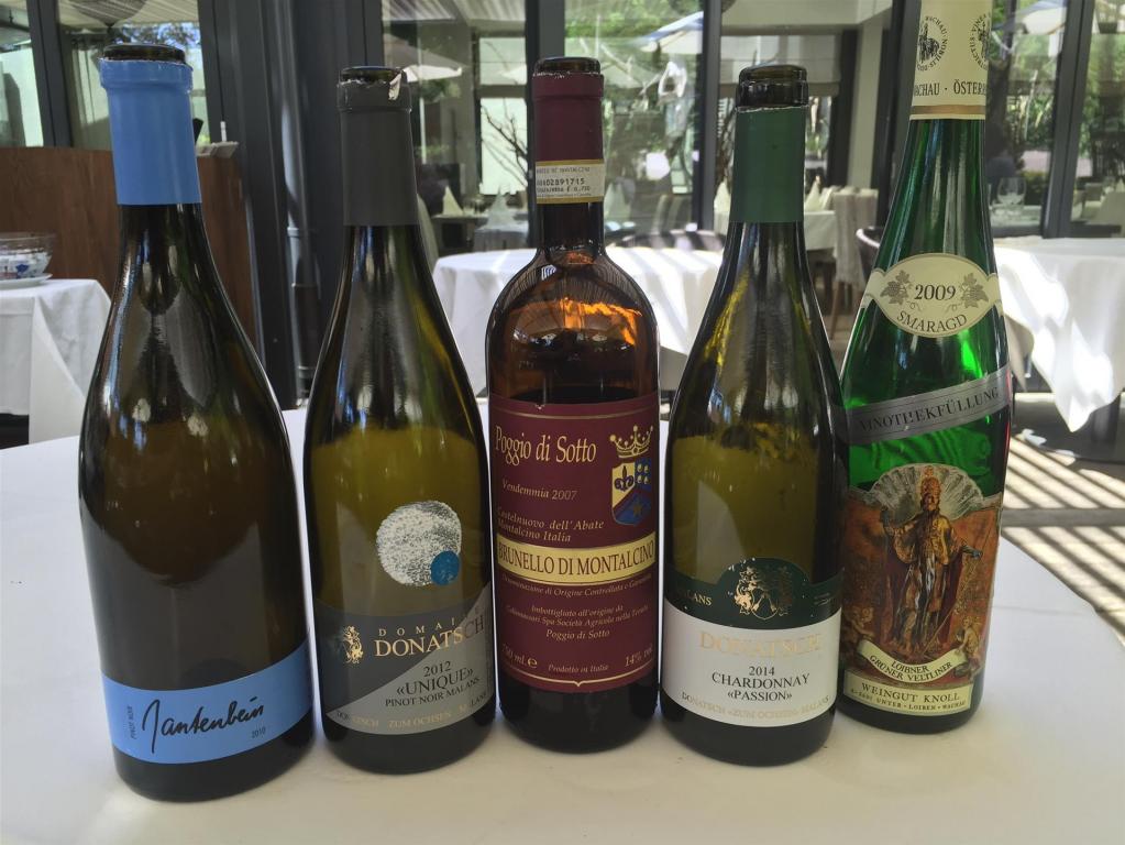 Frisch, etwas verhalten und sehr geradlinig der 2014 Chardonnay Passion von Donatsch – WT91. Wir wussten nicht, dass auch der 2014 Chardonnay Unique von Donatsch im Keller des Hauses lag, denn auf der Karte stand er nicht. Wir haben ihn mitgenommen und später noch im Hotel getrunken. Das war natürlich etwas unfair, denn die Gläser waren dort zu klein und Karaffe gab es keine. Natürlich war das war ein noch viel zu junges, sehr konzentriertes Weinbaby, qualitativ auf ähnlichem Level wie 2013, aber derzeit ist noch Warten angesagt. Was beeindruckte, war auch hier die straffe Mineralität und die Geradlinigkeit. Corton Charlemagne lässt grüßen. Da kommen sicherlich mal WT96 oder sogar etwas mehr ins Glas. Also Warten und rechtzeitig dekantieren. Füllig, kräftig und sehr würzig der pfeffrige 2009 Grüner Veltliner Vinothek von Knoll mit cremiger Textur, sehr druckvoll und mit leicht barocker Struktur, die perfekt zum Etikett passt. Der Bischof ist vorne drauf, sein Dom in der Flasche. Ein großer Wein, der noch zulegen dürfte – WT95+. Burgund pur der sehr elegante, feine und harmonische 2010 Gantenbein Pinot Noir. Sehr feingliedrig mit betörender, rotbeeriger Frucht und feinem, süßem Schmelz, wunderbare Länge – WT95. Zum Vergleich tranken wir dagegen den ebenfalls großartigen 2012 Pinot Noir Unique von Donatsch, der stoffiger, fülliger und kräftiger wirkte und in seiner Konzentration an große Neue Welt Pinots erinnerte – WT95. Extrem spannend der dritte „Burgunder“, ein 2007 Brunello di Montalcino von Poggio di Sotto. Der war noch so jugendlich, zeigte längst nicht alles, war aber so hoch aromatisch und dabei burgundisch im besten Sinne mit einer feinen Kräuternote und seidiger Eleganz, die Säure des Sangiovese nicht störend – WT94+ Auch der dürfte gut alten und noch zulegen.