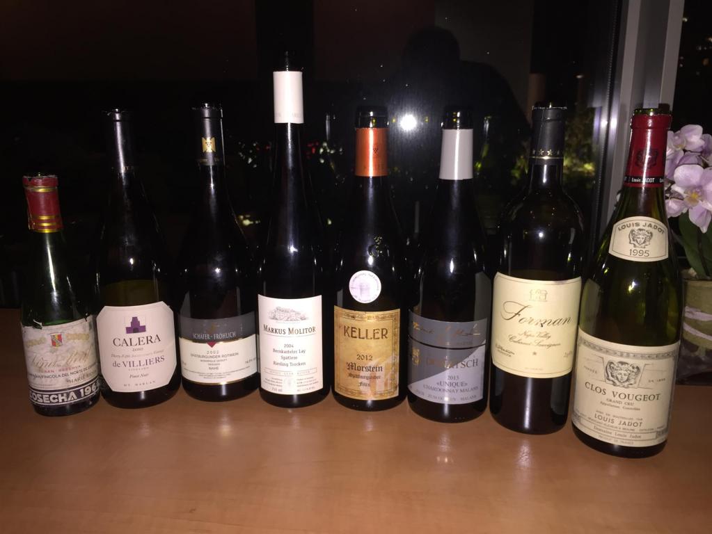 Damit waren wir in der trockenen Abteilung. Ein richtig großer, weißer Burgunder, sehr würzig, mineralisch mit feinem, nussigem Schmelz, komplex und lang mit einfach traumhafter Trinkigkeit war mal wieder dieser 2009 Meursault Charmes Hospice de Beaune Cuvée Bahezre de Lanlay ausgebaut von Lucien Le Moine aus der Magnum- WT96. Auf sicher gleichem Niveau, aber noch so blutjung mit toller, präziser Frucht und genialer Struktur das eigentlich noch nach ein paar Jahren Lagerung schreiende 2009 Morstein GG von Keller – WT95+. Erstaunlich reif, aber mit Eleganz, Kraft und Substanz aus der Magnum das 2008 Brunnenhäuschen GG von Wittmann – WT93.